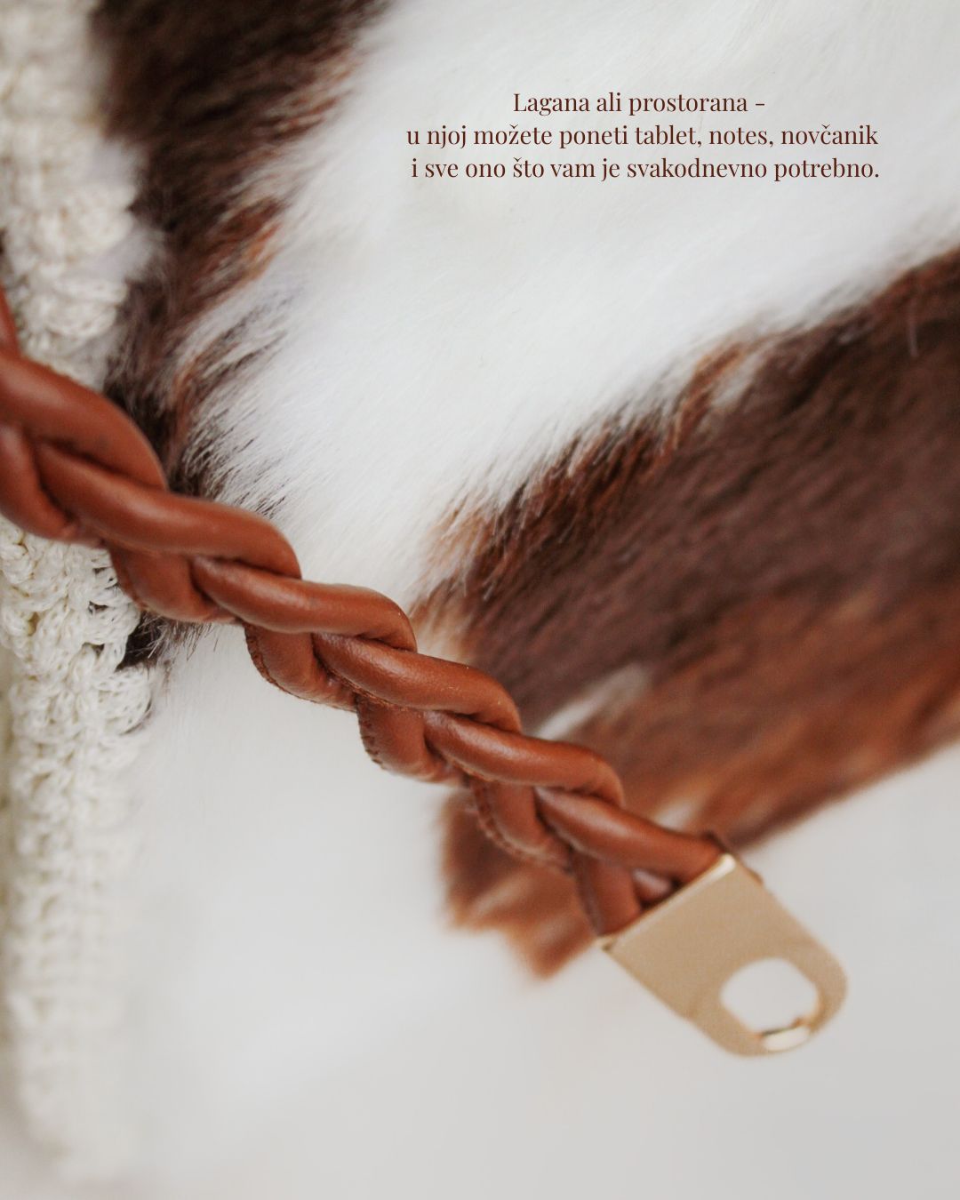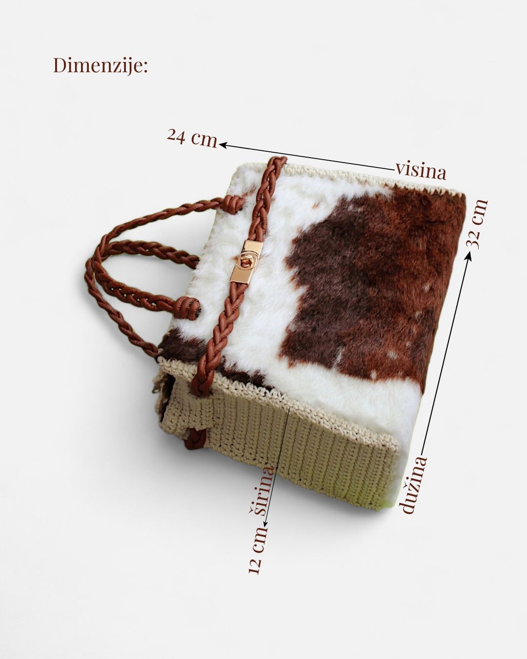 MATERIJAL: Veštačko krzno, trake od veštačke kože, akrilni konac, metalna galanterija, satenska podstava DIMENZIJE: dužina 32 cm × visina 24 cm × širina 12 cm OPIS: Torba je 100% handmade od visoko-kvalitetnog veštačkog krzna, koje se ne linja i ne ostavlja tragove na garderobi. Torba ima heklane stranice, kao i ručke i ukrasnu traku od veštačke kože. Pored toga, ima unutrašnju satensku podstavu i unutrašnje ojačanje, te je čvrste forme i neće se deformisati tokom nošenja. Prostrana, lagana i udobna za nošenje, ova torba može poneti tablet, notes, novčanik i ostale sitnice te je idealni aksesoar za svakodnevno nošenje Dizajn je unikatan.
