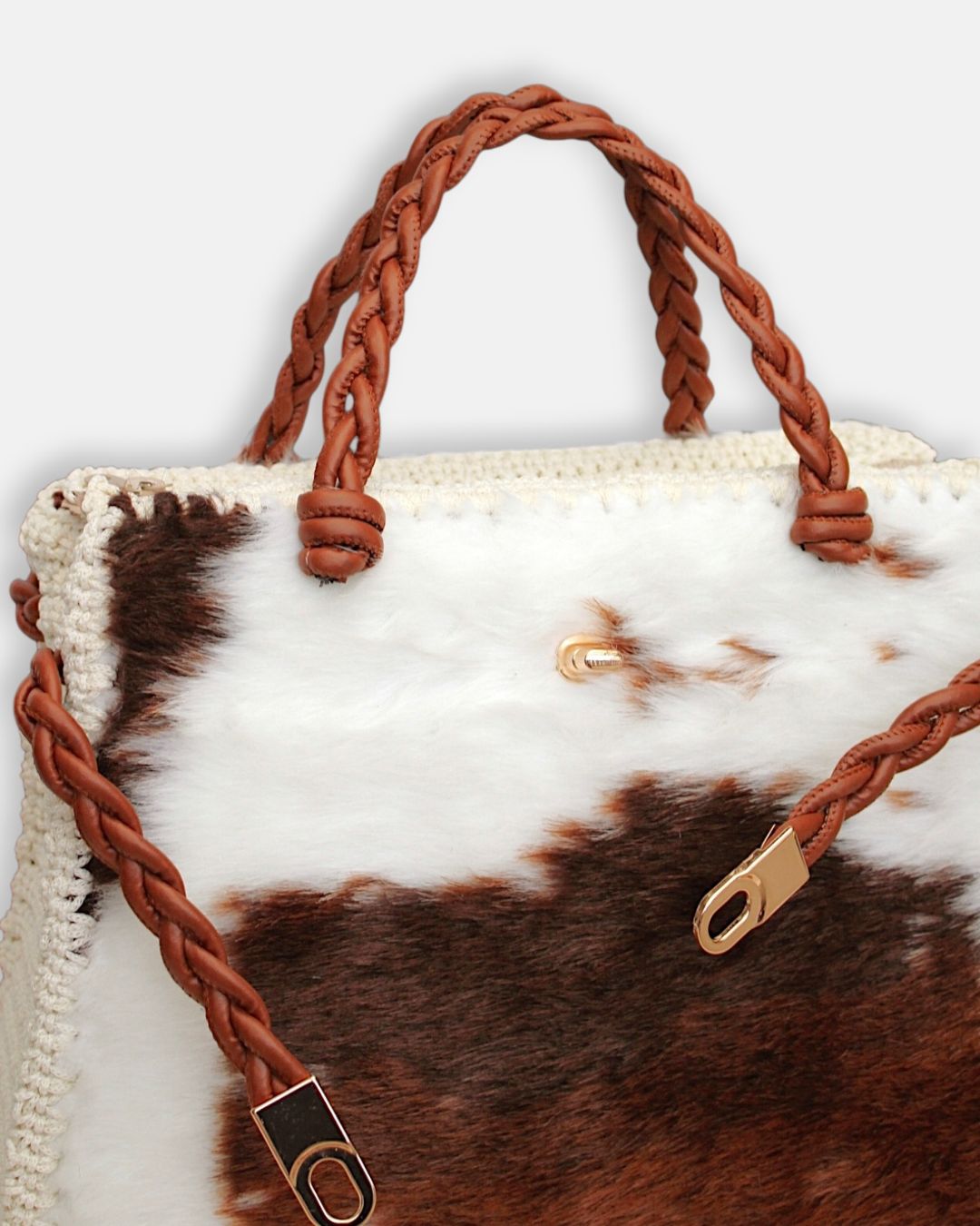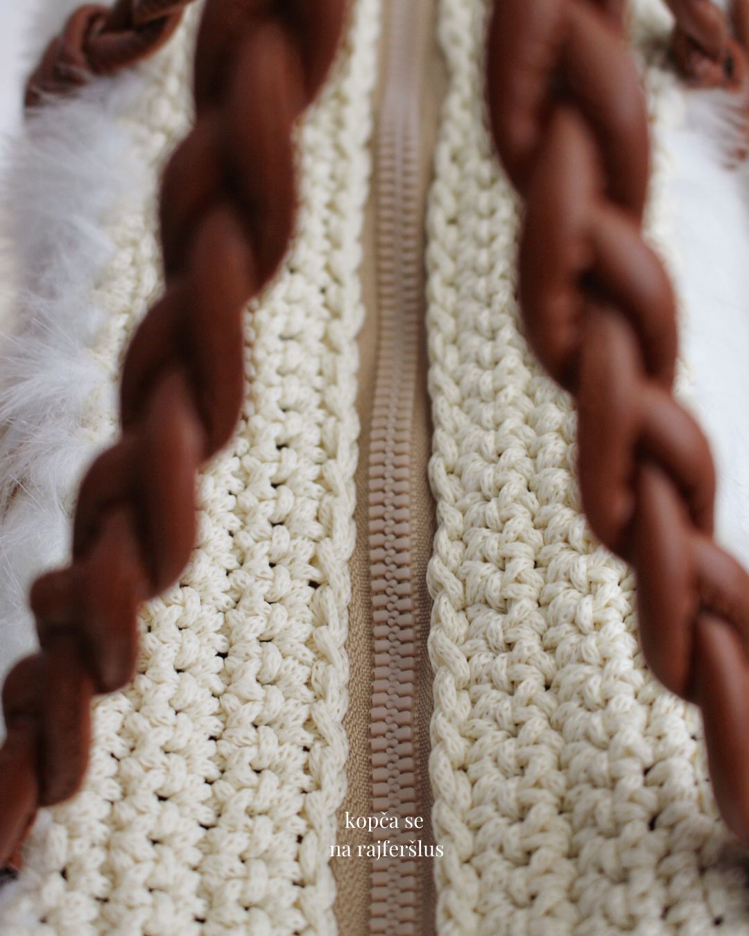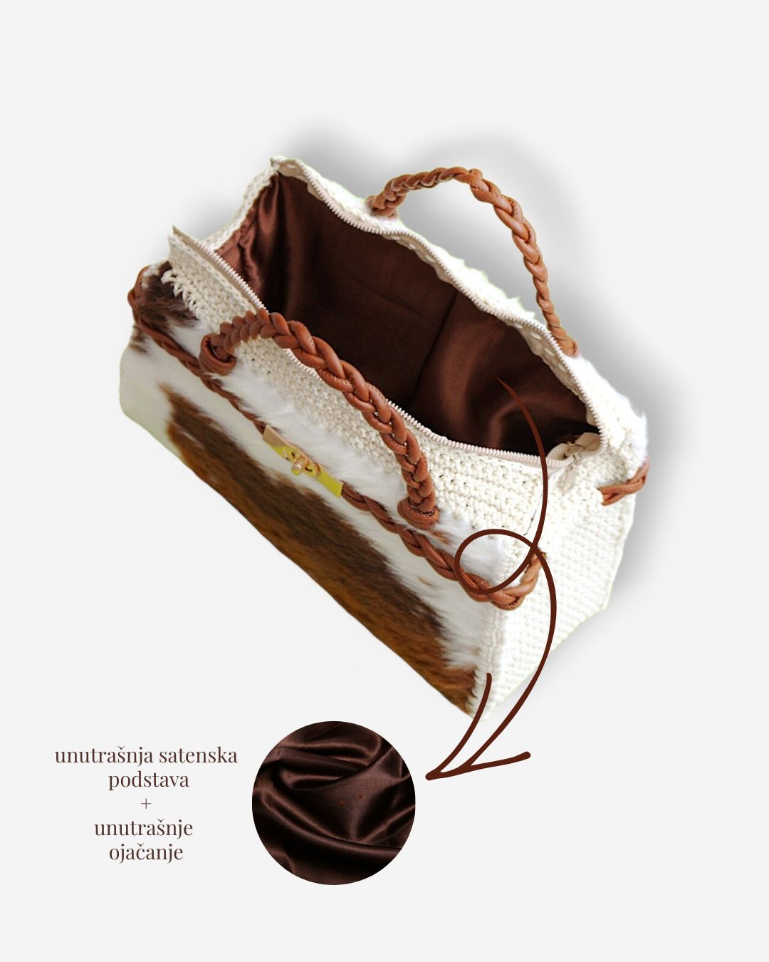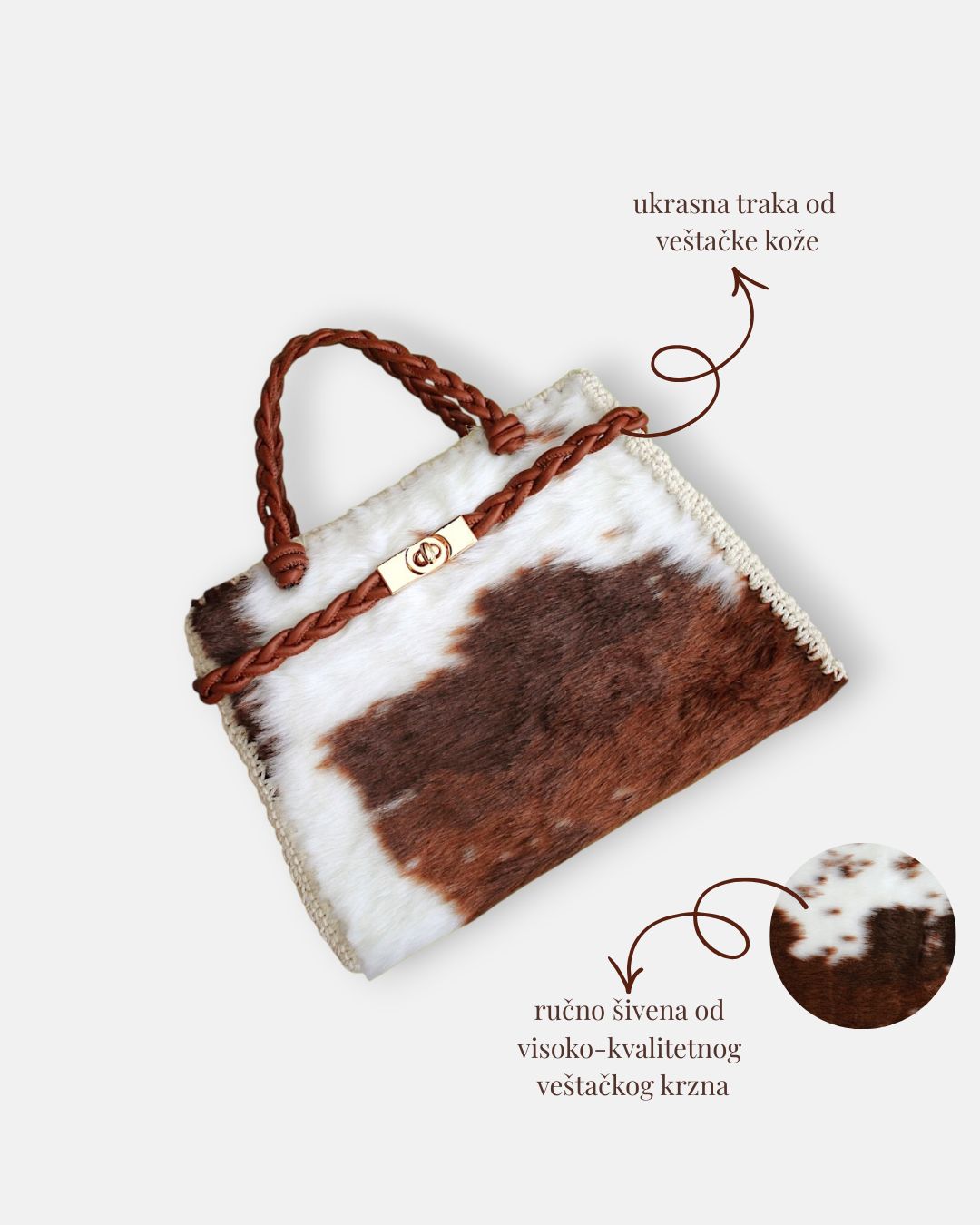 Torba je 100% handmade od visoko-kvalitetnog veštačkog krzna, koje se ne linja i ne ostavlja tragove na garderobi. Torba ima heklane stranice, kao i ručke i ukrasnu traku od veštačke kože.
