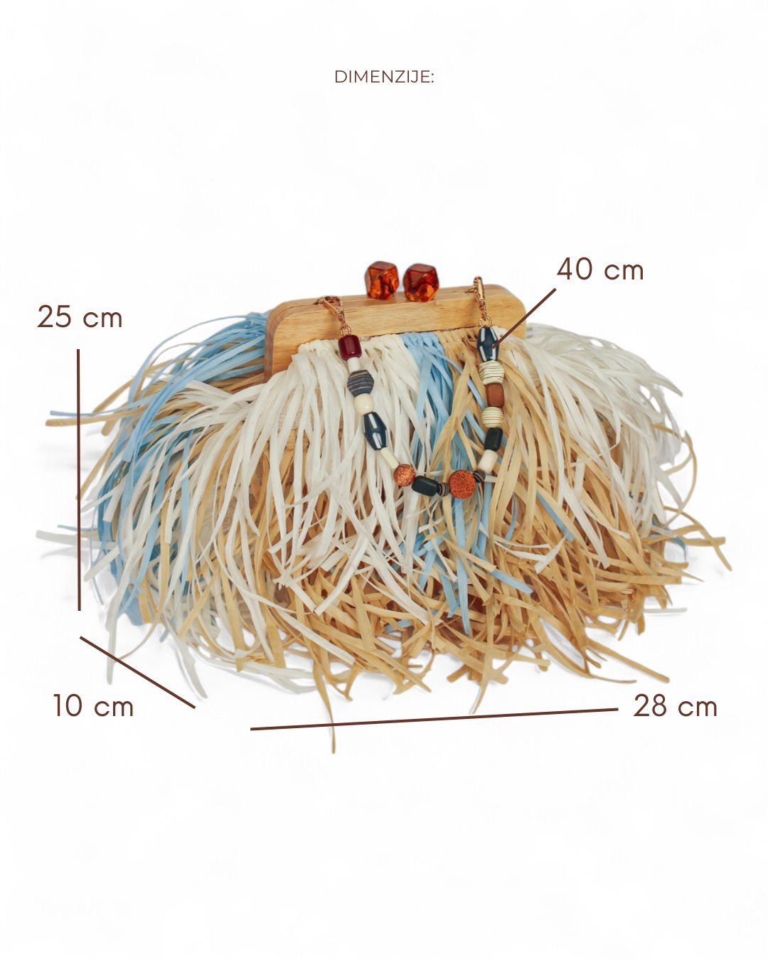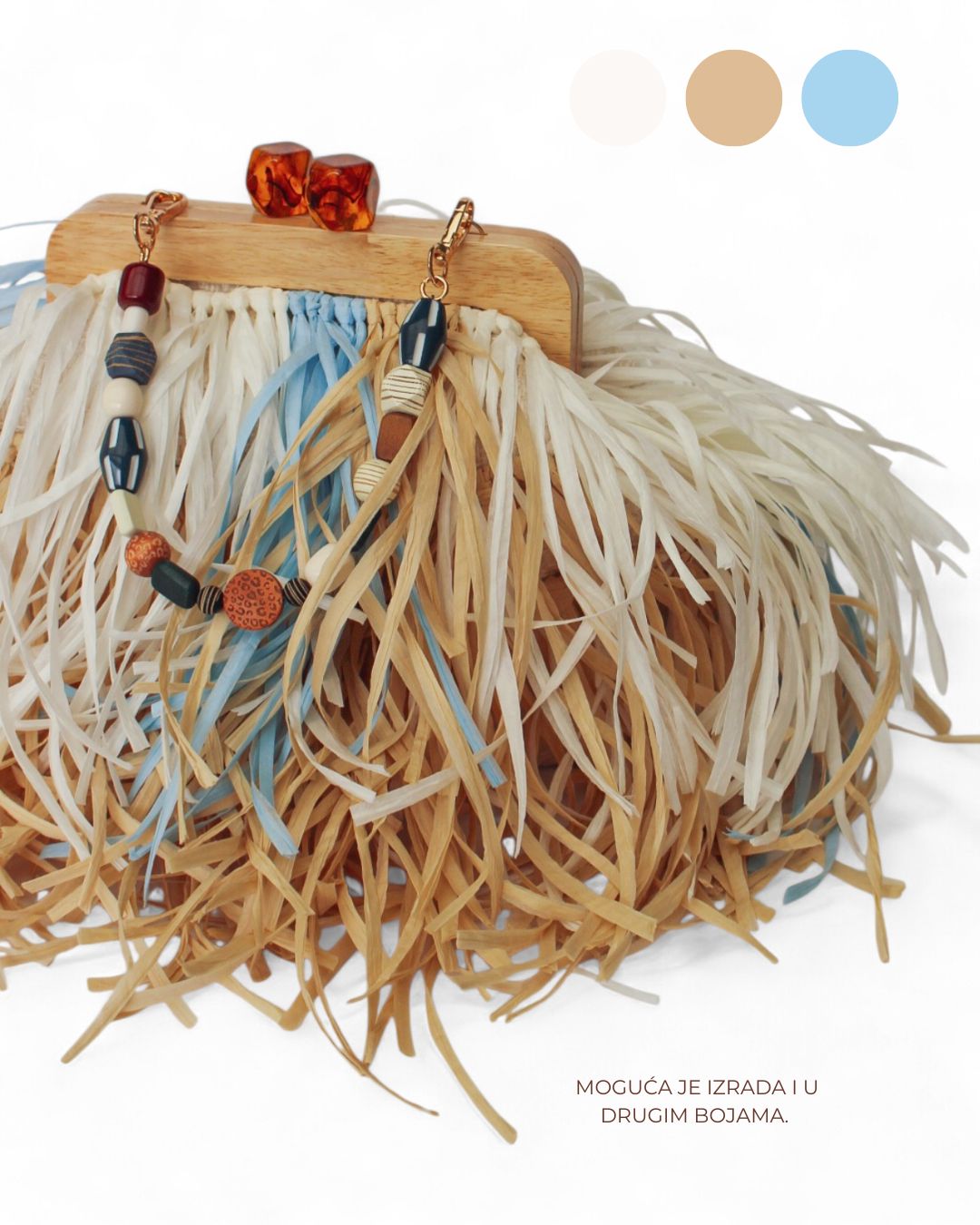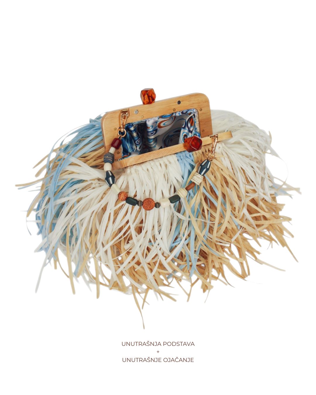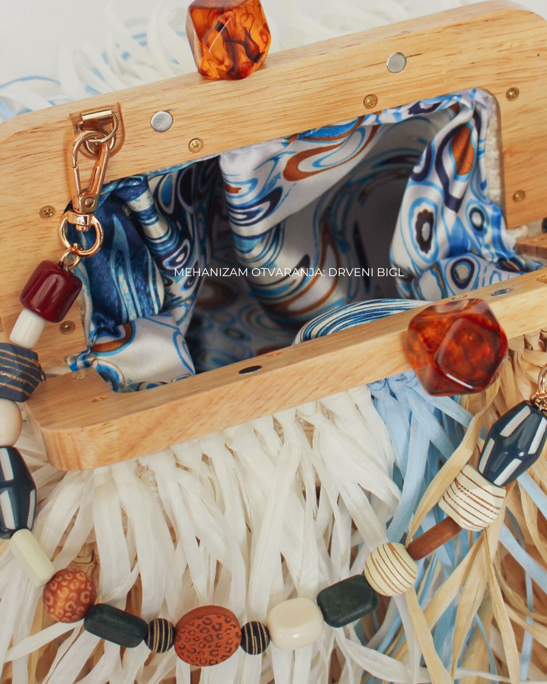 MATERIJAL: Rafija, metalna galanterija, drveni bigl, pamučna podstava DIMENZIJE: dužina 28 cm × visina 25 cm x širina 10 cm × dužina ručke 40 cm OPIS: Heklana torba sa resama od rafije i drvenim biglom, u kombinaciji boja svetlo plava- bela- svetlo braon. Torba ima unutrašnje ojačanje tako da je čvrste forme i neće se deformisati tokom nošenja. Pored toga, ima unutrašnju pamučnu podstavu, kao i ručku. Metalna galanterija je u boji zlata.. Vrlo je prostrana i lagana tako da je idealna za svakodnevno nošenje. Dizajn je unikatan.⠀