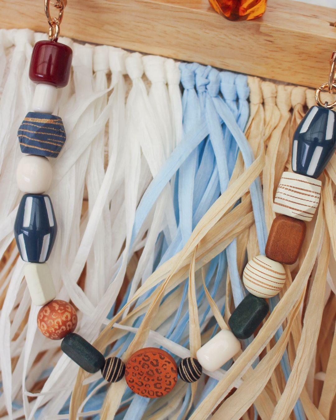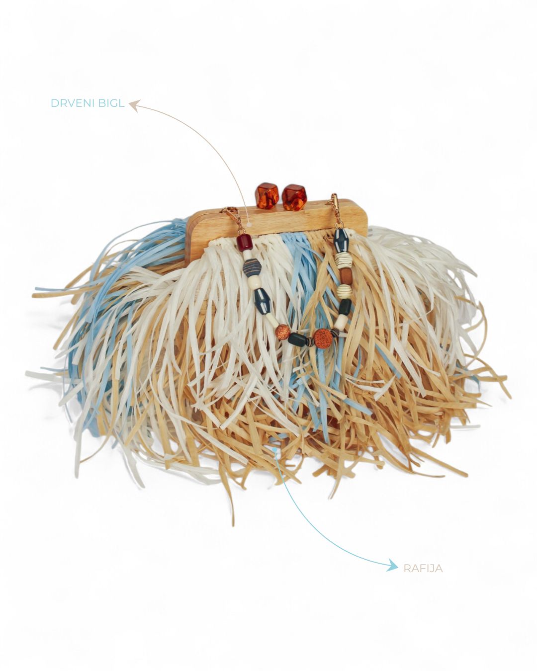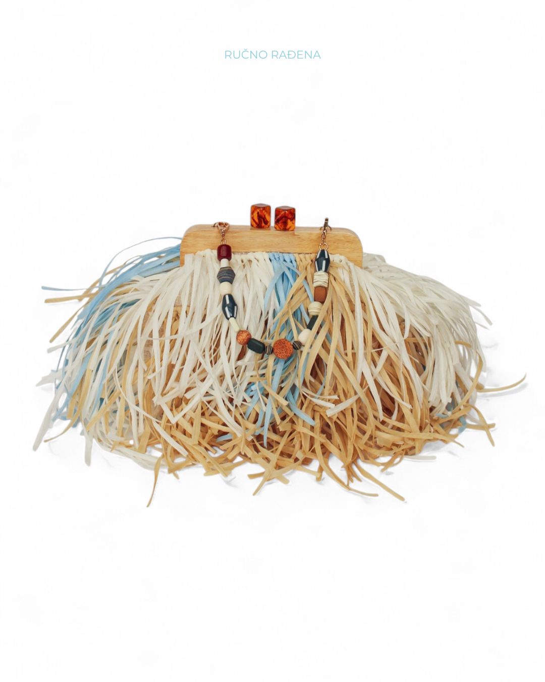 Pletena torba sa resama od rafije u tri boje i drvenim biglom.