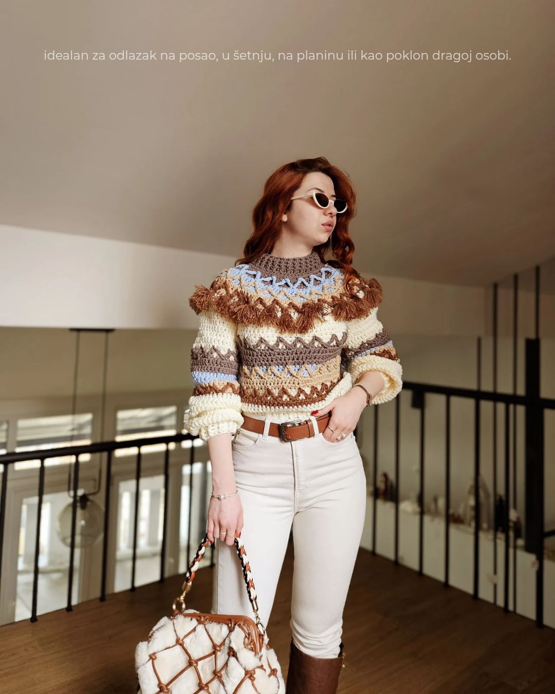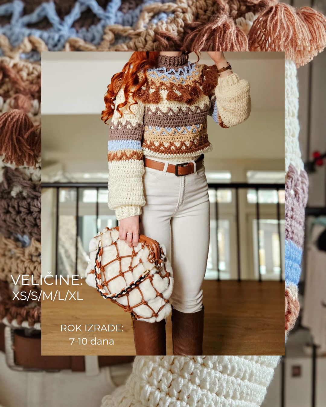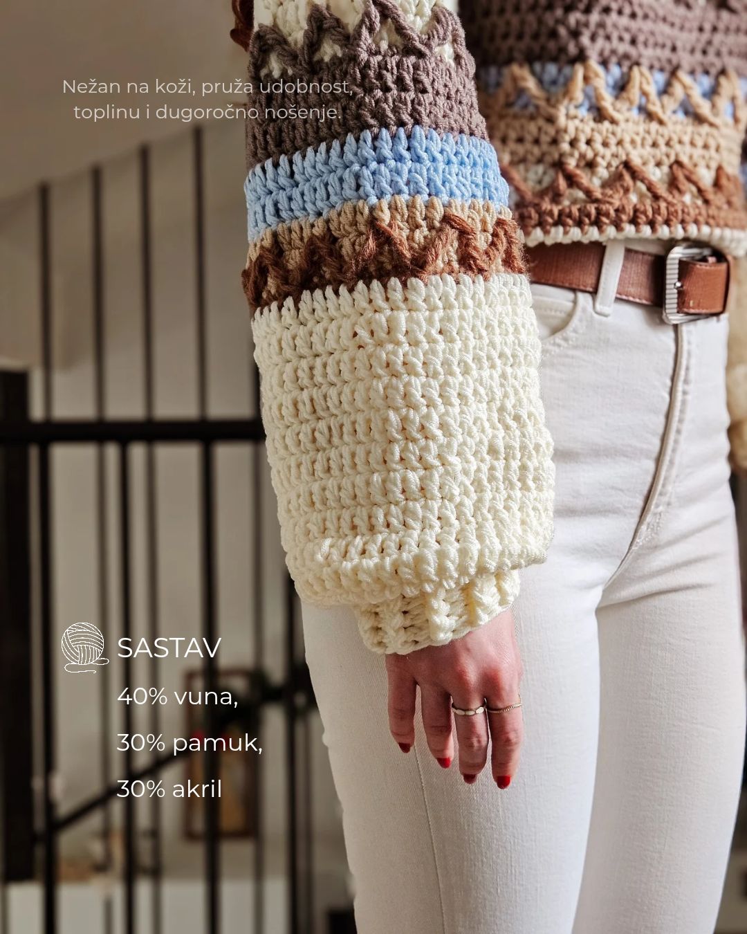 MATERIJAL: 40% vuna, 30% pamuk, 30% akril VELIČINE: XS, S, M, L, XL ODRŽAVANJE: Kardigan je periv u mašini na 30°, preporučeni programi su: ručno pranje i wool wash. Poželjno je sušiti kardigan u horizontalnom položaju, kako ne bi promenio formu, posebno u predelu ramena i rukava. OPIS: Ručno heklan ženski džemper, sa polurolkom i širim rukavima, heklan je pletiva koji u svom sastavu sadržu vunu, pamuk i akril te je nežan na koži i vrlo prijatan za nošenje. Lako se kombinuje uz sve odevne kombinacije, bilo da idete na posao, u šetnju ili na planinu. Dizajn je unikatan.