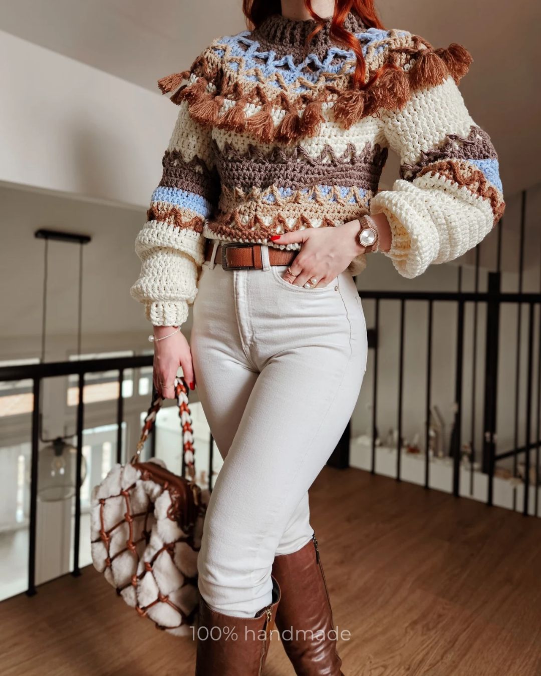 Ručno heklan ženski džemper, sa polurolkom i širim rukavima, heklan je pletiva koji u svom sastavu sadržu vunu, pamuk i akril te je nežan na koži i vrlo prijatan za nošenje.